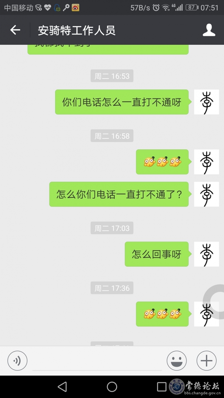 lyq891216:这个可以告诉你我还真不是这家公司工作人员和托,我就是一常德上班的公职人员,我是因为安骑特那时候我投诉一些事情,就在这种机缘巧合下加了他们工作人员微信,就有什么问题问他们,关于退押金的事他们给我微信回复就是说要一个月退。如果你有需要我也可以把...http://175.6.36.125/bbs-read-jump?pid=4624471麻烦把安骑特工作人员微信号发一哈谢谢。 |
