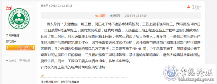 您反映的天源鑫座二期夜间施工问题,我局一直在重点监管。现工程正处于地下室防水阶段,工艺上需要连续作业时间较多。每次夜间连续施工都经过了住建局质监站核定,属工艺需要,必须连续作业。对此,给您生活上带来的不便请您谅解! |