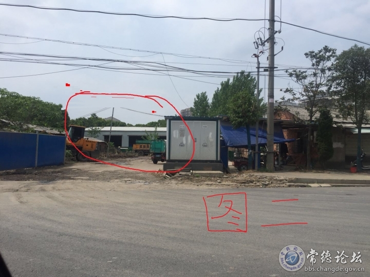 图二为现在的样子,红色标示内为新建厂房,里面可以看到垃圾运输车,还有修建公路的施工车,并对地面进行了硬化处理,