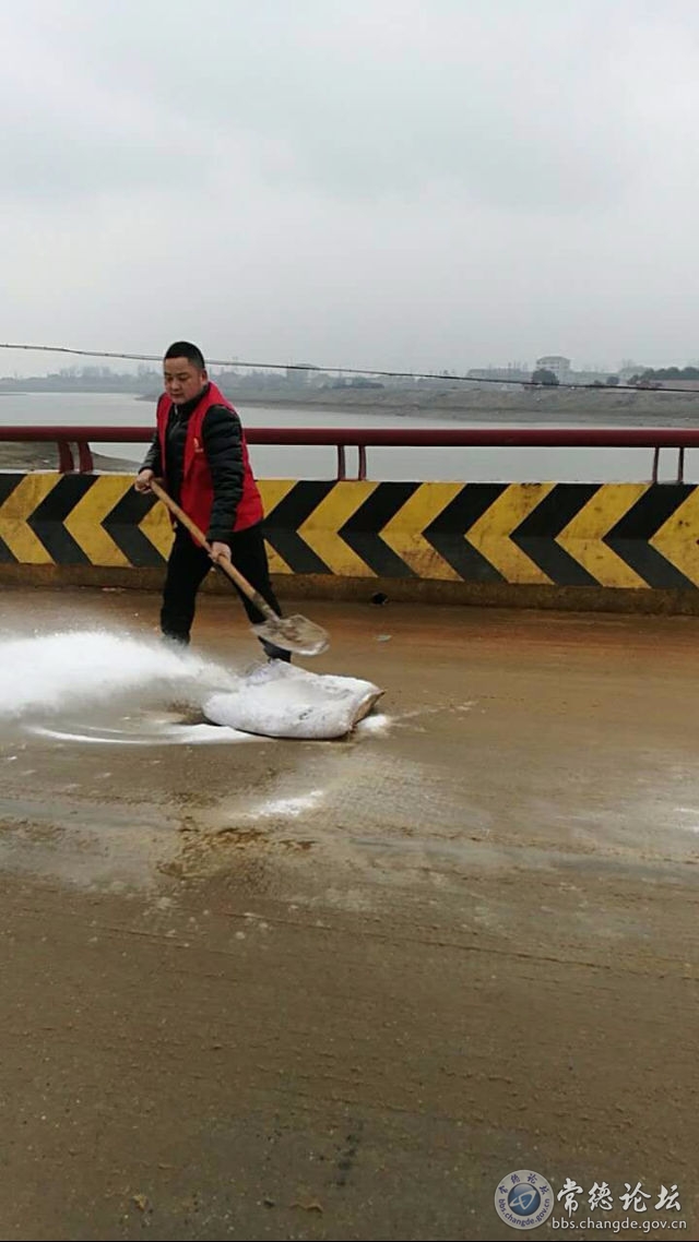 年后又一轮冰冻雨雪天气来袭。为确保该镇主干道路畅通,杨明带领镇工作人员与志愿者在桥上进行除冰作业。