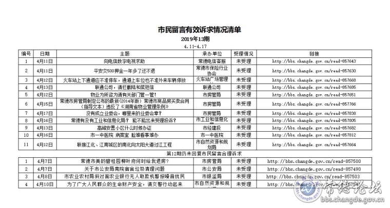 市民留言网上诉求快速处理情况通报(2019年第13期)