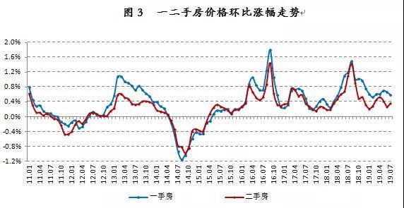 一线城市房价涨幅从2017年5月后基本保持平稳,7月份一线城市中除了北京外,房价均环比上涨;二线城市涨幅从19年1月后连续扩大3个月,5、6月份已经开始收窄,7月份略有扩大;三线城市涨幅从3月份后开始收窄,7月份有所扩大。