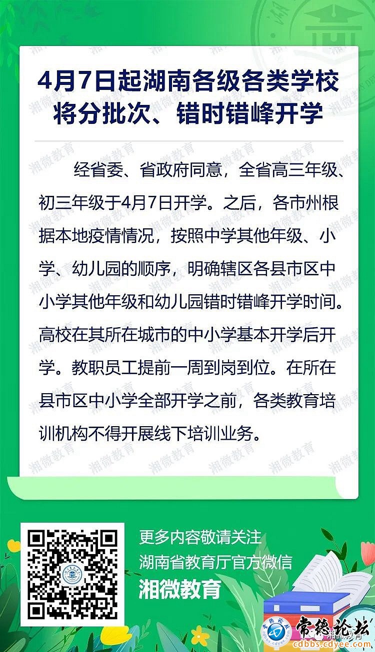湘江闲人:本市开学时间要等市教育局发佈为准!http://175.6.36.125/bbs-read-jump?pid=4889683市教育局要听省教育厅的。这是省教育厅发的官方消息 |