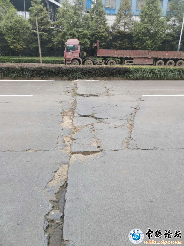 德山经开区有德路(德山大道至崇德路段),有多处道路破损,宽度长的达三条车道,很长时间不见修补,晚上又没路灯,很容易出事故,望经开区道路管理部门几时修补,消除安全隐患。(此为道路上的一处破损)