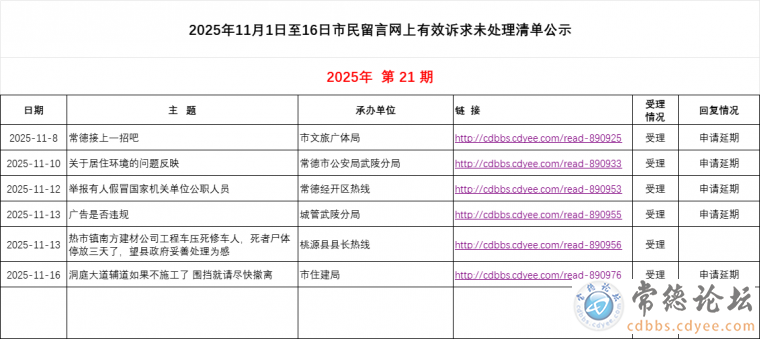 常德《市民留言》网上有效诉求未处理清单公示