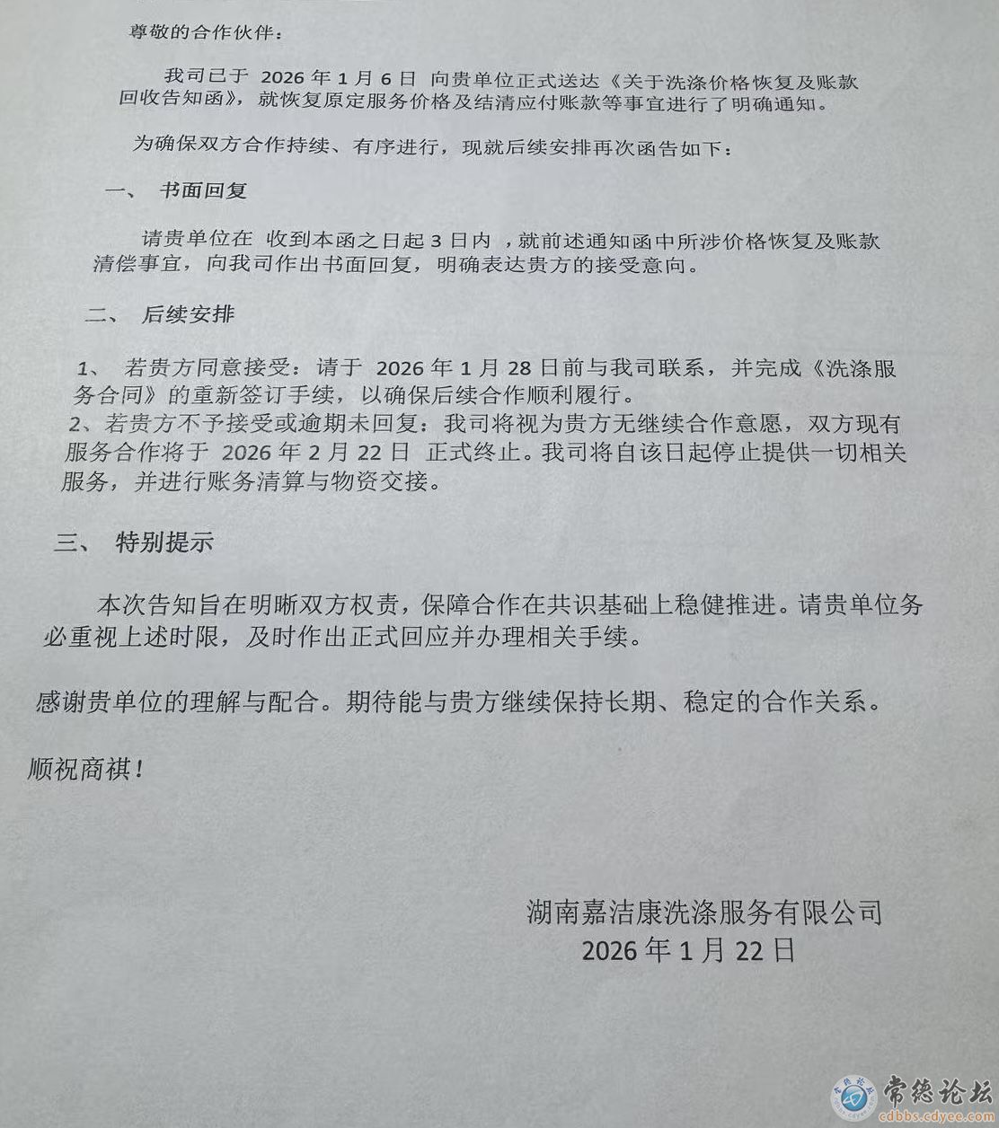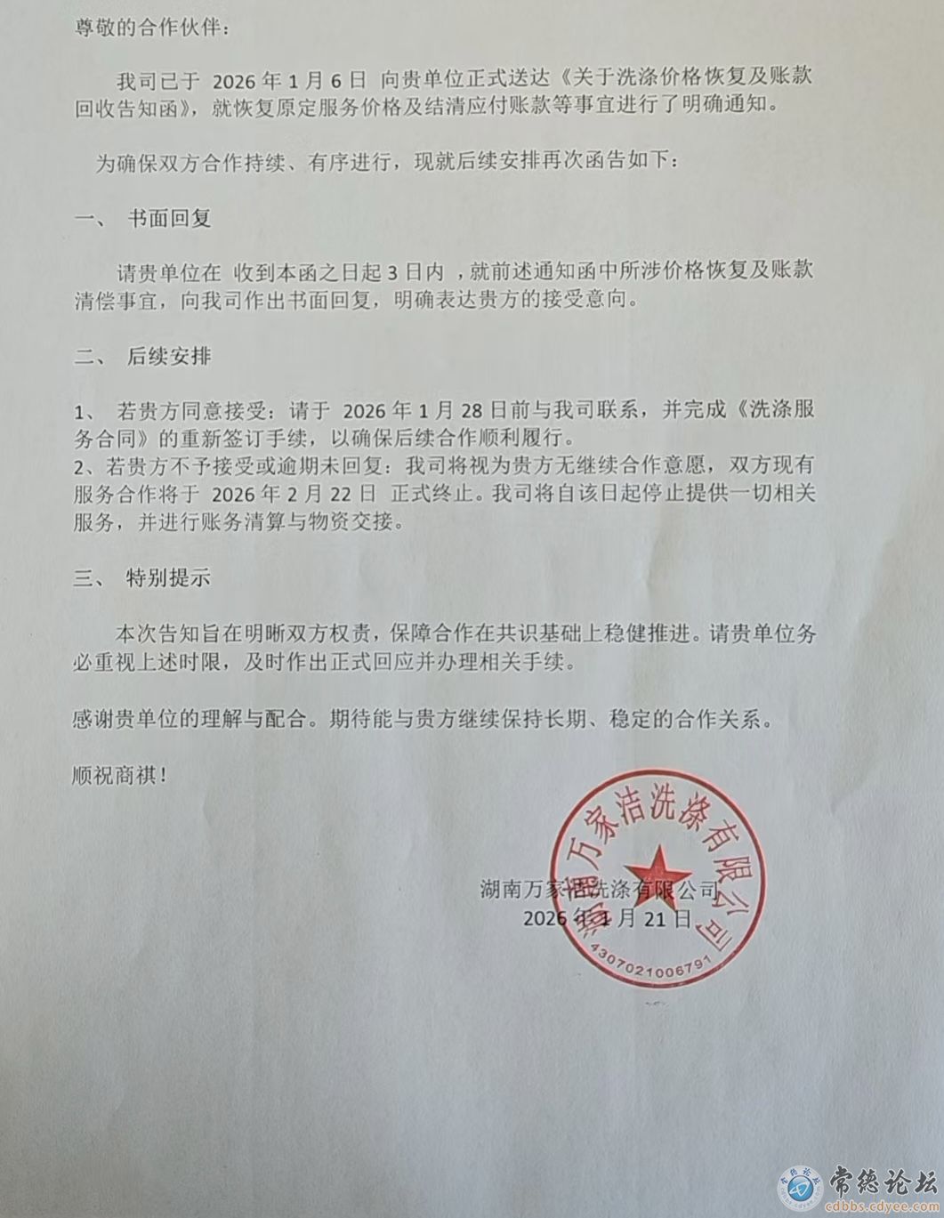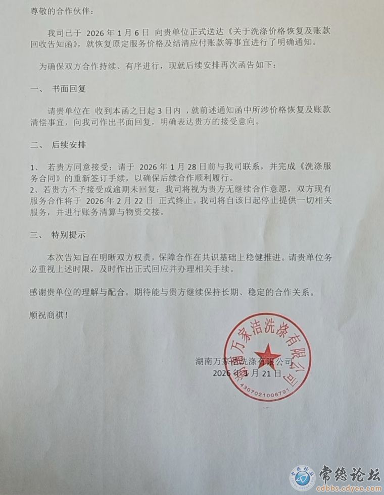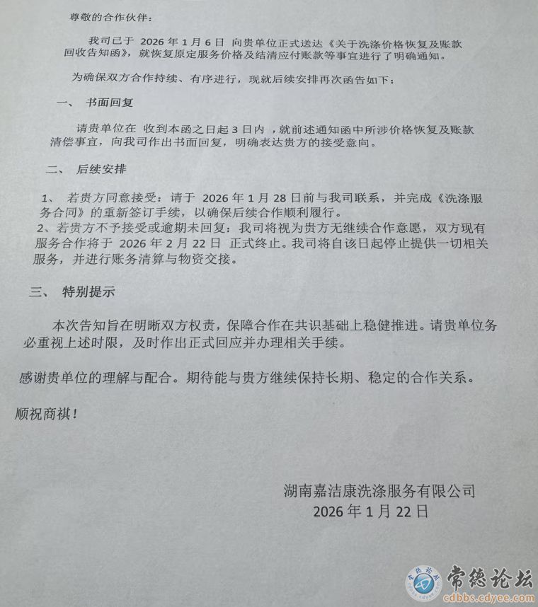 常德市湖南万家洁涤有限公司、湖南嘉洁康洗涤服务有限公司现为常德市唯二两家大型布草洗涤公司,占据了常德市酒店行业99%的布草洗涤市场份额。现在两家公司串通联手起来,于2026年1月6日、1月22日连续两次同时向常德几百家酒店发出了《关于洗涤价格恢复及账款回收告知函》,而其所谓的恢复价格原为报价,该价格远远高于长沙、益阳、张家界、荆州等周边城市的洗涤价格。(见附表)万家洁和嘉洁康此次联手这就等于美团、阿里合并联营。