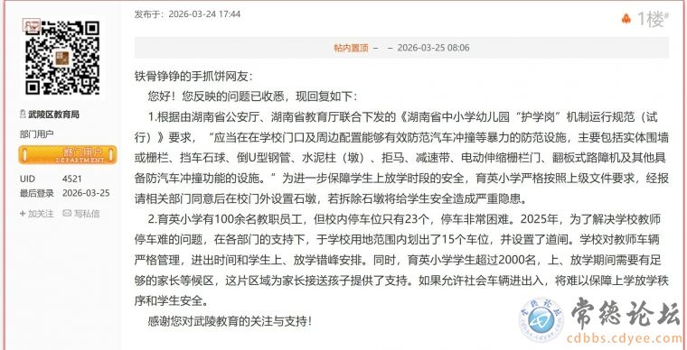 yushizaitu:不搞猜测不搞主观判断,用事实说话。强烈要求武陵区教育局和武陵区育英小学公布车位审批手续以及合法合规的文件,学校用地红线范围图,以打消广大网友的疑惑。http://175.6.36.125/bbs-read-jump?pid=5101589