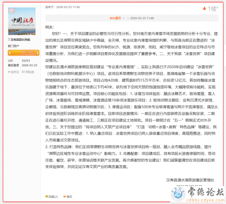 诸恶莫作:官方根本没有理睬楼主的建议,只给了一个普通游客的待遇:项目建成后来体验指导。一句客套话而已,楼主还拿来给自己脸上贴金,真滑稽http://175.6.36.125/bbs-read-jump?pid=5101690你难道没看见,官方回复里面,汉寿已经在建滑雪馆? |