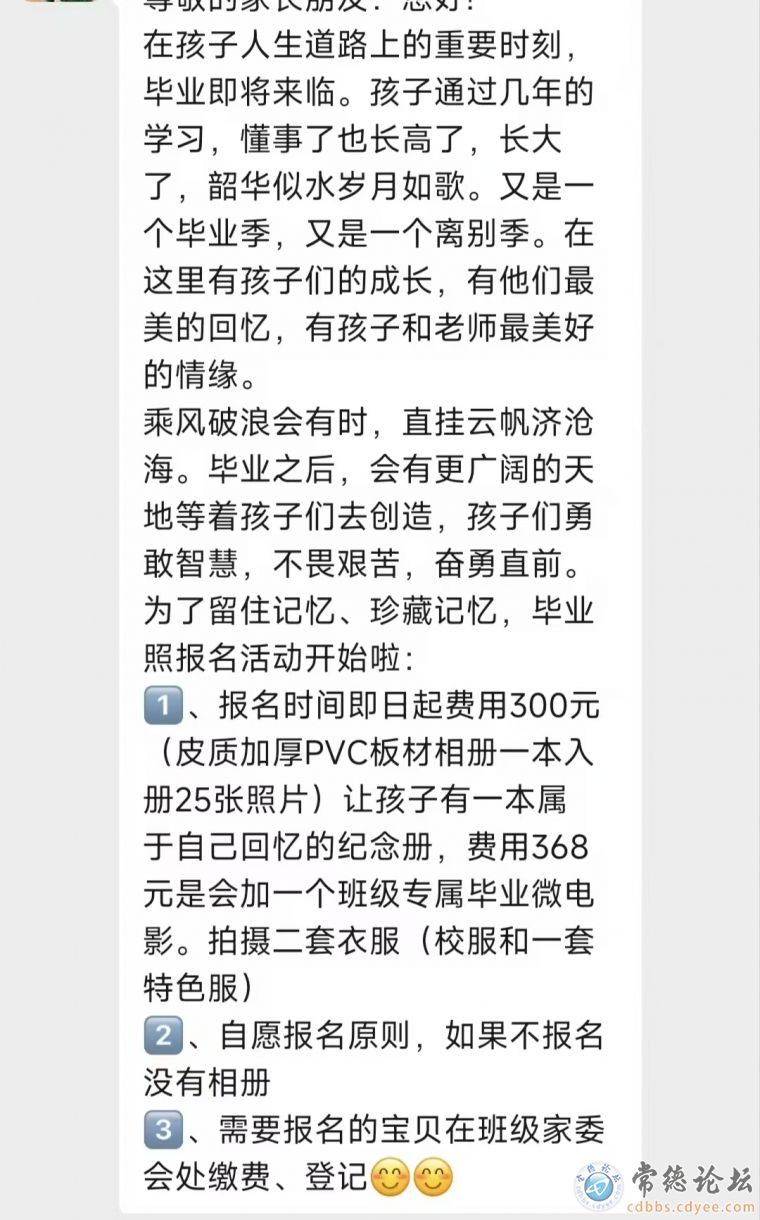 芷兰学校小学六年级140班,家长群发微信通知,一起照毕业照,需每人交368元,请问是否合理。