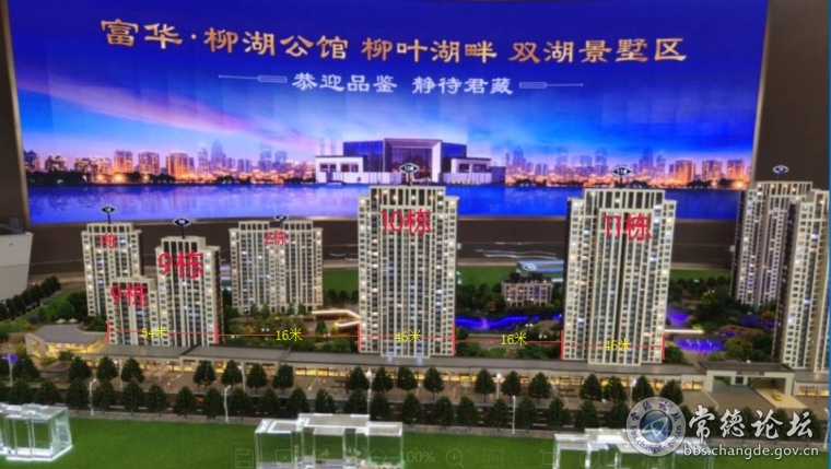 大家注意看富华柳湖公馆沙盘照片,9栋10栋实际间距16米多,9栋从左到右楼宽54米多,沙盘上把16多米居然比54米还宽那么多!看起来多宽敞呀!